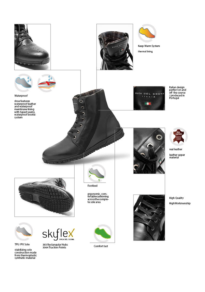 For the interior finishing of Duca del Cosma shoes we use a micro-fibre material with a membrane and waterproof tape sealing. Duca del Cosma employs the Cosmo-hbr membrane, one of the best on the market. We spend a lot of time and money on testing waterproofness and functionality to ensure your feet remain constantly dry, whilst still being able to “breathe”. Even so, the upper leather has to be treated in regular intervals to ensure humidity runs off and does not soak in, so that the leather maintains its suppleness. We guaranty waterproof under normal wearing circumstances and up to 4,5 cm on the boot from the ground.
